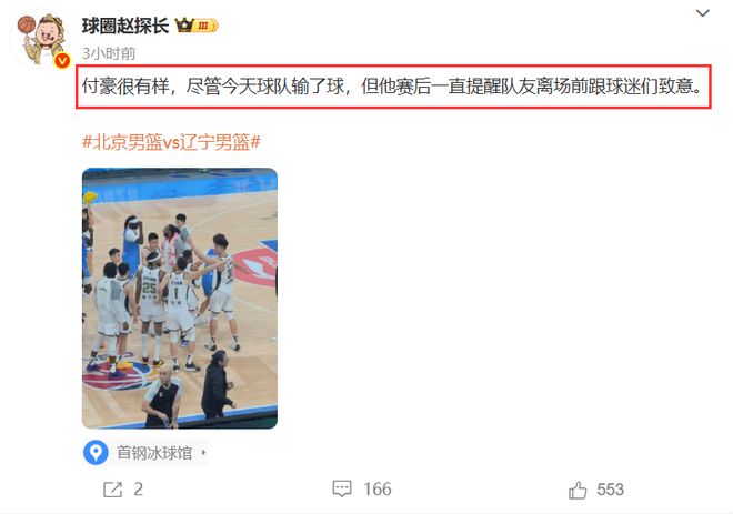 输球后提醒队友致谢球迷,付豪守住辽宁体面,更显得杨鸣像个小丑
